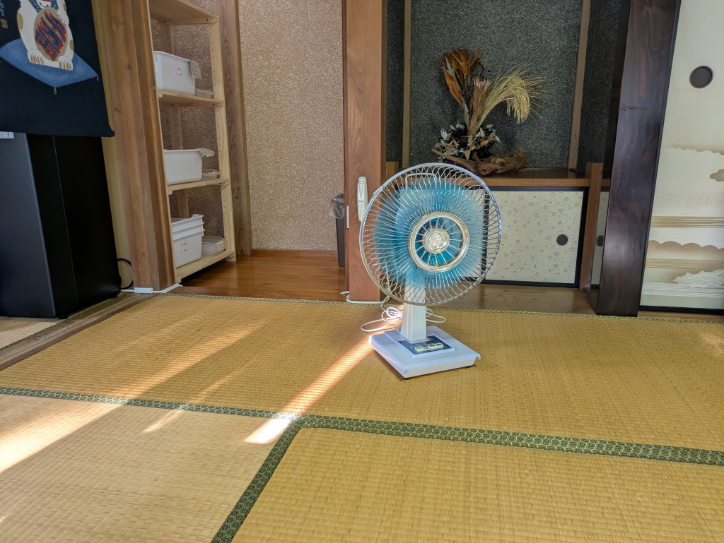 「おばあちゃんちに来たみたい!」と写真をたくさん撮られていたレトロな扇風機。